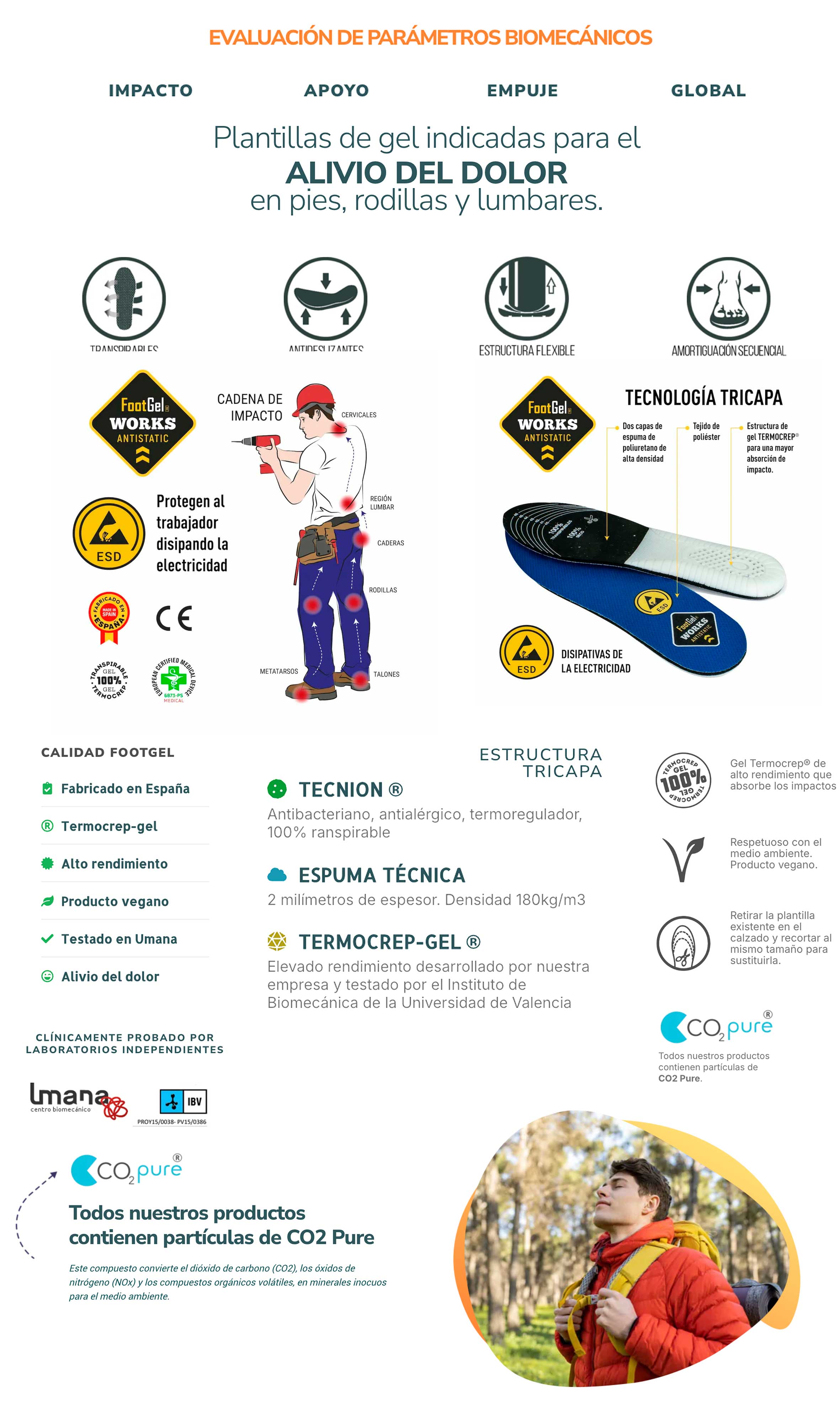 Footgel Plantilla Calzado Antistatic. Las plantillas FOOTGEL WORKS ANTI-STATIC protegen al trabajador disipando la electricidad. Su triple capa ÚNICA y EXCLUSIVA ha sido desarollada para este objetivo. Testeado por el Centro de Análisis Biomecánico Umana, GARANTÍA y CALIDAD
