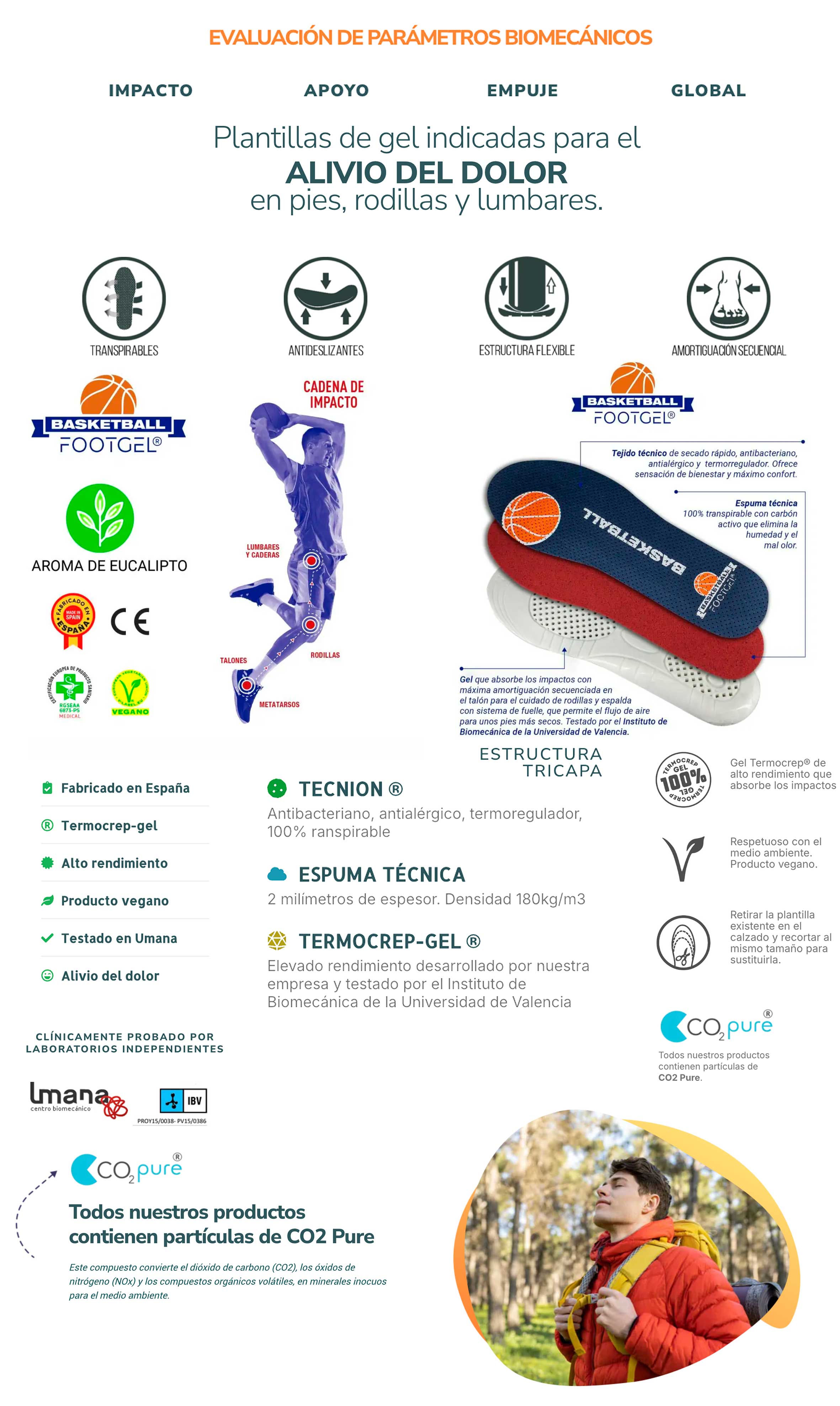 Footgel Plantilla Calzado Basket. Las plantillas FOOTGEL BASKET están especialmente recomendadas para la práctica del Basktball por su alta absorción de impactos y protección que ofrecen, mejoran el rendimiento deportivo y protegen de lesiones. Su triple capa ÚNICA y EXCLUSIVA ha sido desarrollada para este objetivo. Testeado por el Centro de Análisis Biomecánico Umana, GARANTÍA y CALIDAD
