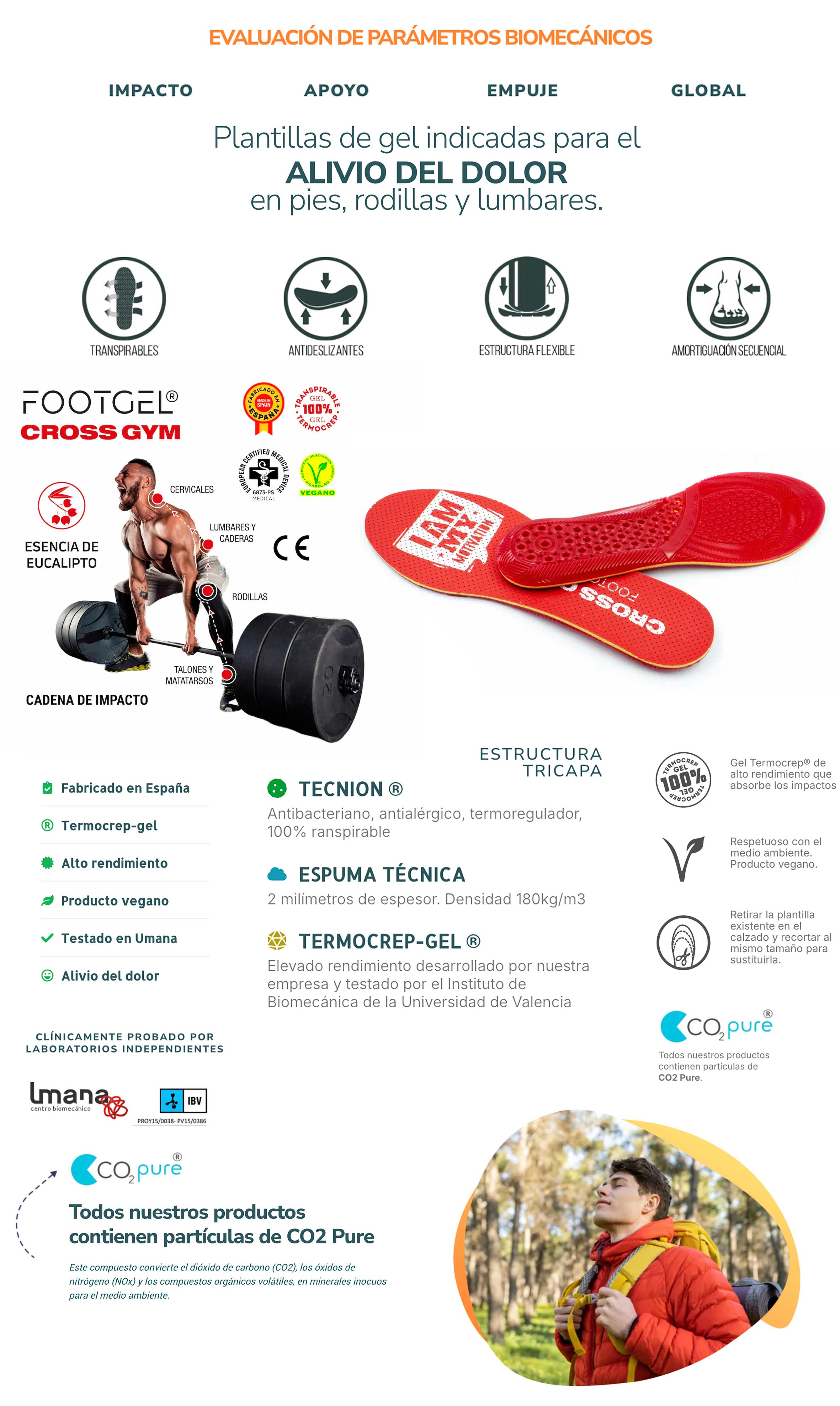 Footgel Plantilla Calzado Cross Gym. El uso de plantillas deportivas Foot Gel® ayuda a prevenir y aliviar lesiones producidas por los impactos contra el suelo al practicar cualquier tipo de actividad deportiva. Foot Gel Sport® incorpora un diseño patentado basado en una arquitectura de DOBLE DESCARGA aplicada en la zona del talón y metatarso, para aliviar la cadena de impactos: PIES → RODILLAS → CADERAS → LUMBARES → CERVICALES