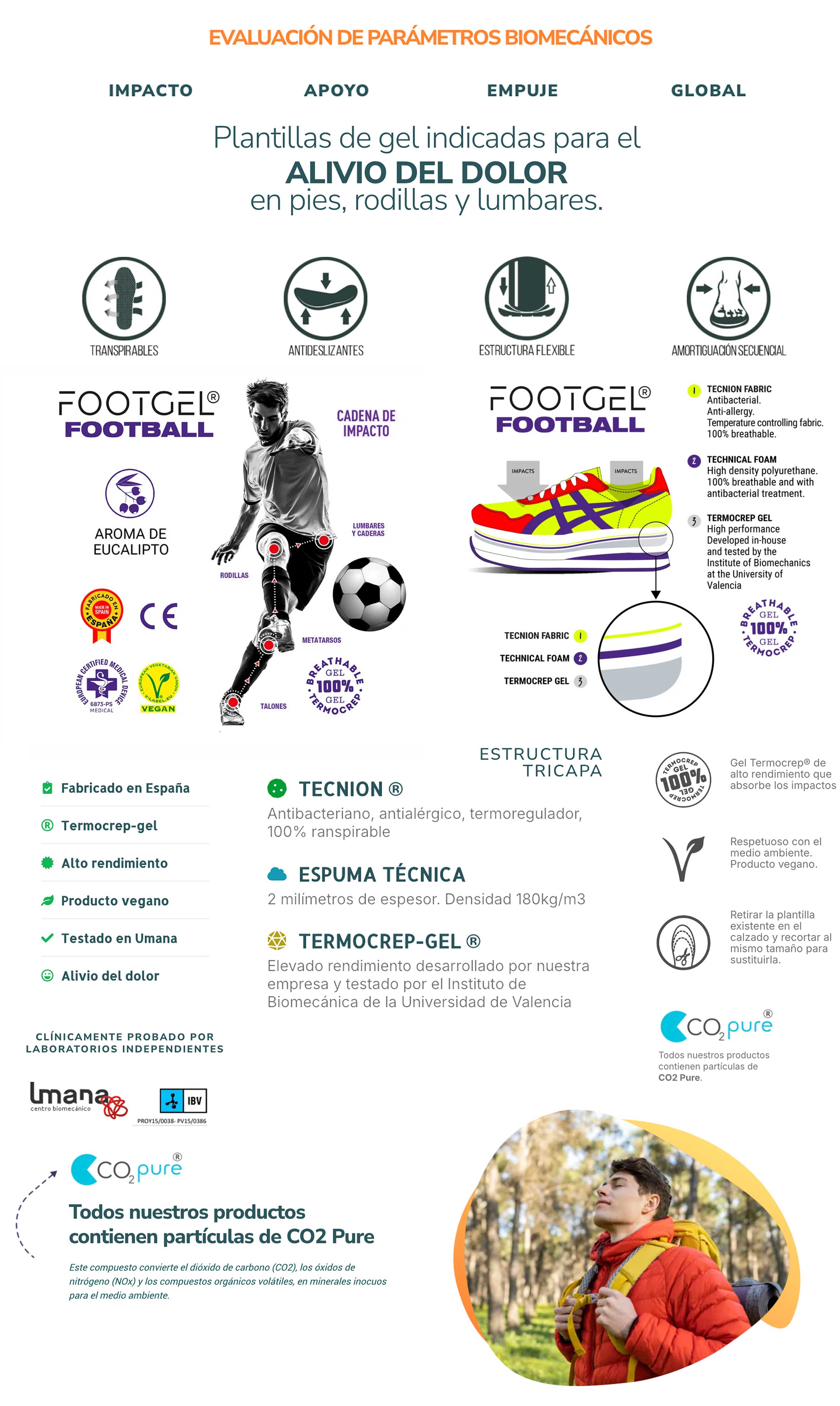 Footgel Plantilla Calzado Football. Las plantillas FOOTGEL FOOTBALL están especialmente recomendadas para la práctica del Football por su alta absorción de impactos y protección que ofrecen, mejoran el rendimiento deportivo y protegen de lesiones. Su triple capa ÚNICA y EXCLUSIVA ha sido desarrollada para este objetivo. Testeado por el Centro de Análisis Biomecánico Umana, GARANTÍA y CALIDAD