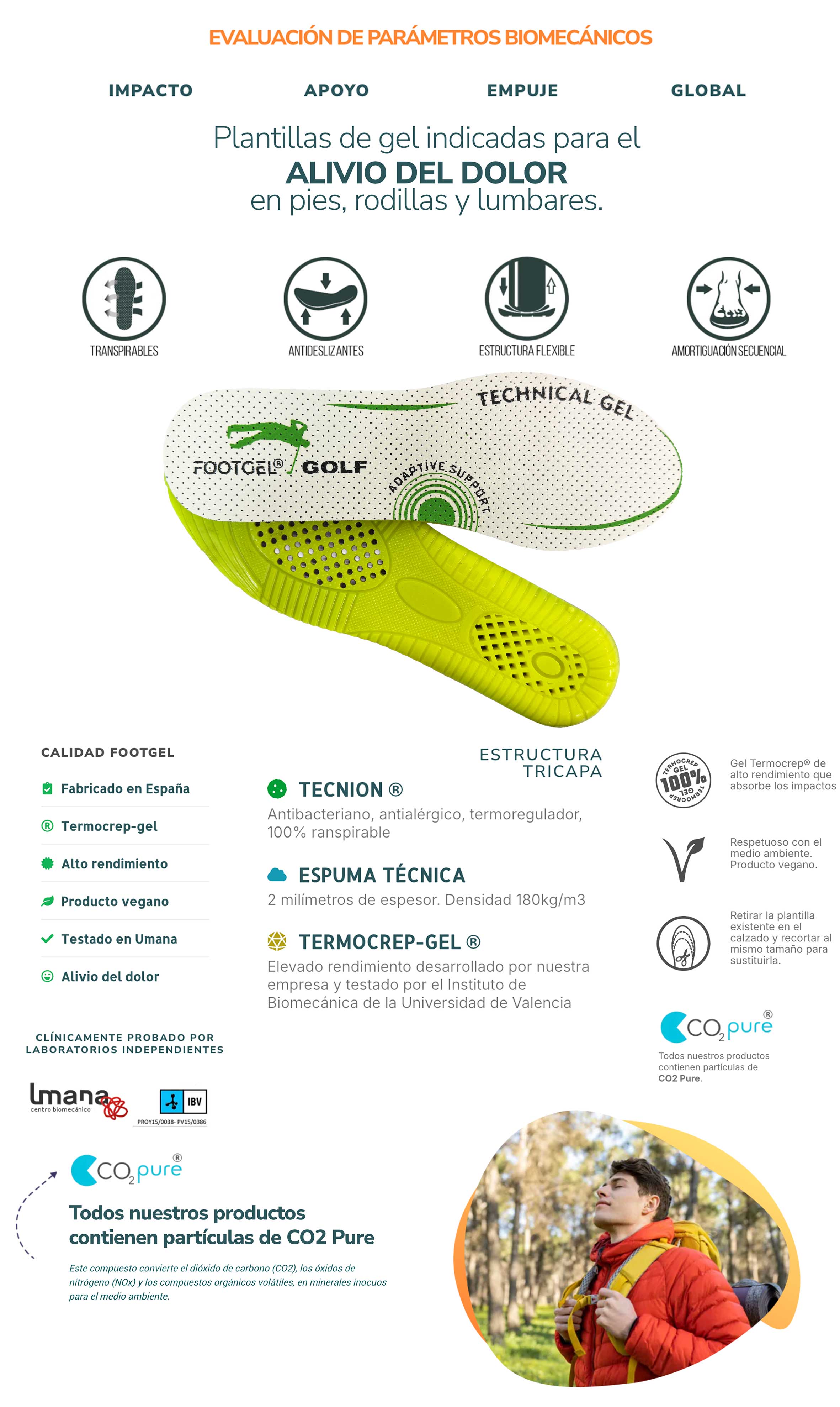 Footgel Plantilla Calzado Golf. El uso de plantillas Footgel Hombre reduce la presión sobre las articulaciones. Con sistema exclusivo de respiración, tejido transpirable antimicrobiano y termoregulador. Footgel Hombre incorpora un diseño patentado de máxima amortiguación para aliviar la cadena de impactos: PIES → RODILLAS → CADERAS → LUMBARES → CERVICALES
