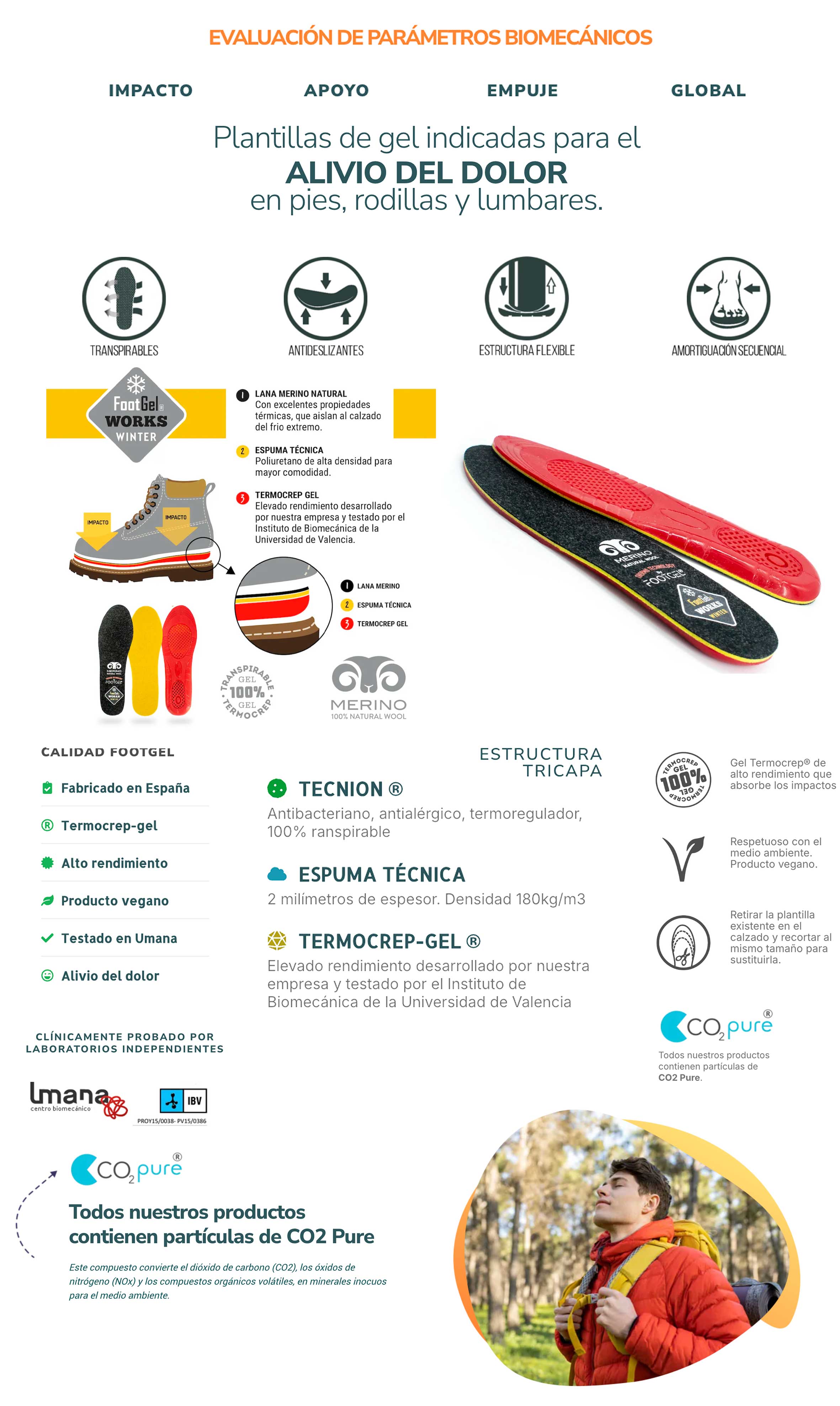 Footgel Plantilla Calzado Work Winter. Las plantillas FOOTGEL WORK WINTER están especialmente recomendadas para aliviar y prevenir patologías del dolor en pies, rodillas y lumbares al realizar cualquier tipo de actividad laboral especialmente de uso en invierno por el alto aislamiento térmico. Su triple capa ÚNICA y EXCLUSIVA ha sido desarollada para este objetivo. Testeado por el Centro de Análisis Biomecánico Umana, GARANTÍA y CALIDAD