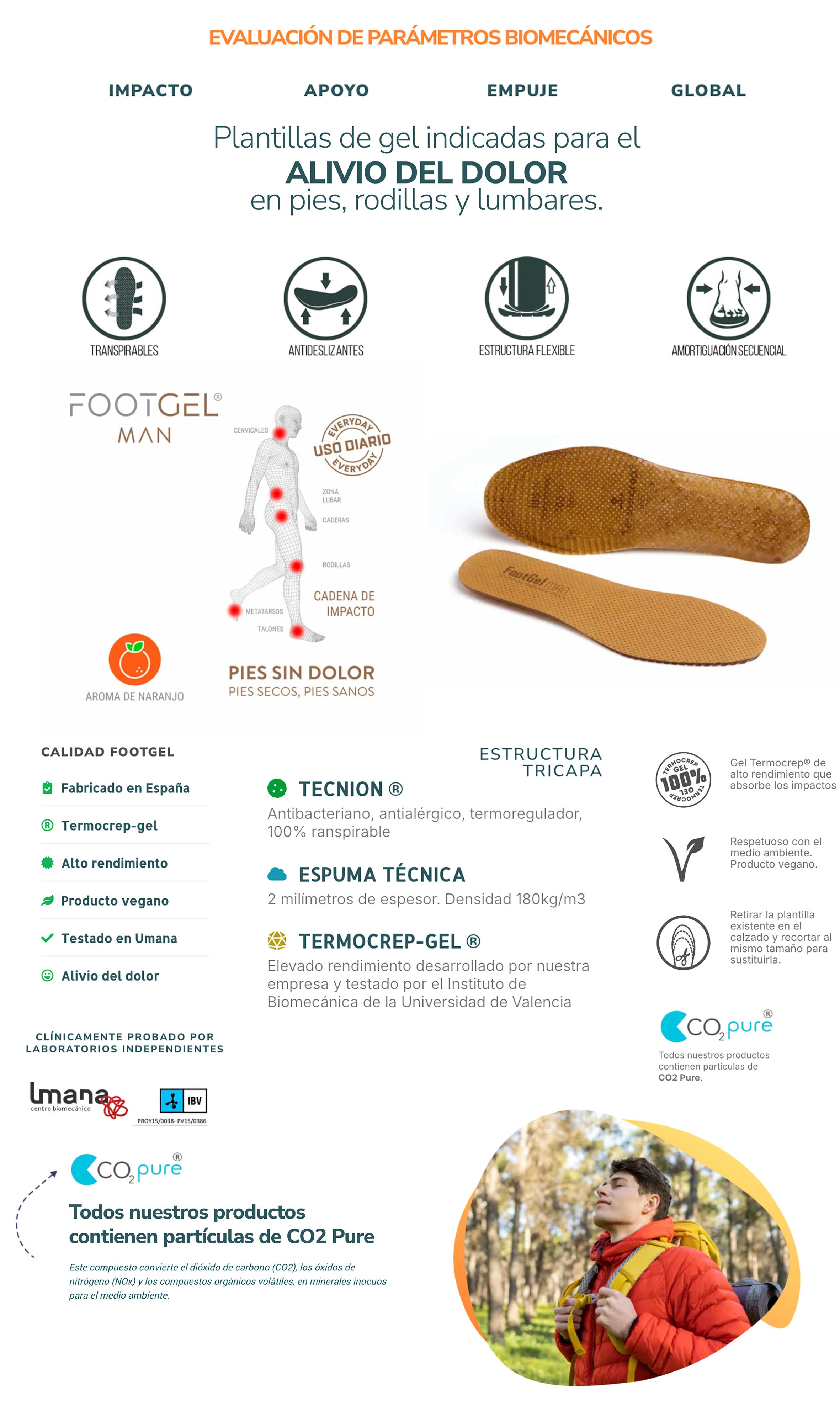 Footgel Urban Man. El uso de plantillas Footgel Hombre reduce la presión sobre las articulaciones. Con sistema exclusivo de respiración, tejido transpirable antimicrobiano y termoregulador. Footgel Hombre incorpora un diseño patentado de máxima amortiguación para aliviar la cadena de impactos: PIES → RODILLAS → CADERAS → LUMBARES → CERVICALES