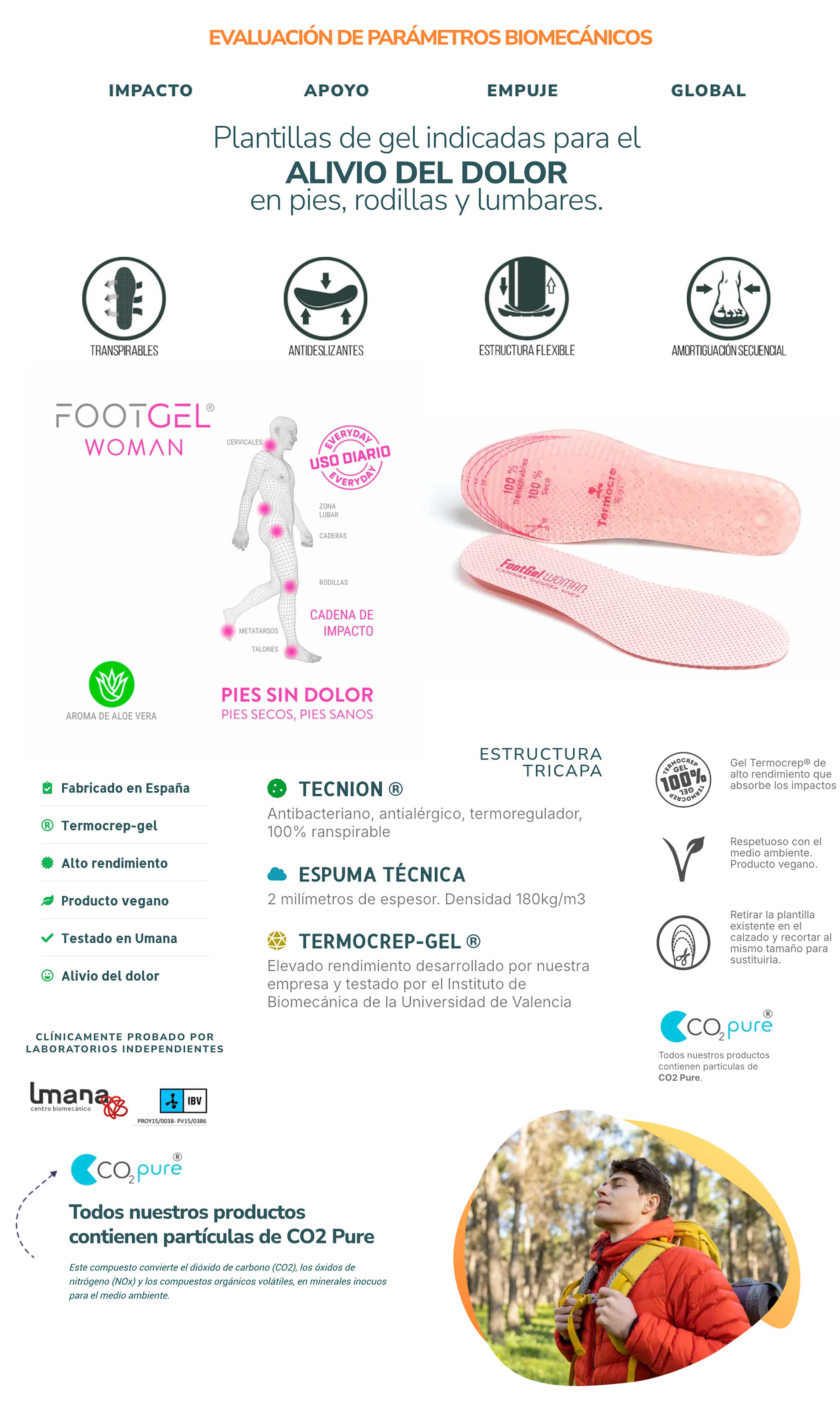 <p>Footgel Urban Woman. El uso de plantillas Footgel Mujer reduce la presión sobre las articulaciones. Con sistema exclusivo de respiración, tejido transpirable antimicrobiano y termoregulador. Footgel Hombre incorpora un diseño patentado de máxima amortiguación para aliviar la cadena de impactos:<strong> PIES → RODILLAS → CADERAS → LUMBARES → CERVICALES </strong></p>