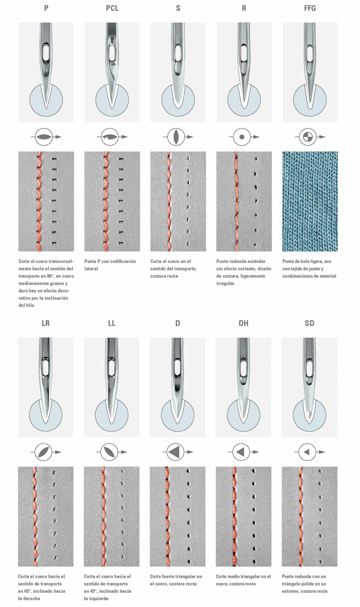Dependiendo del material a coser algunas puntas son mas adecuadas que otras. Para cueros y pieles gruesos se recomiendan puntas cortantes.