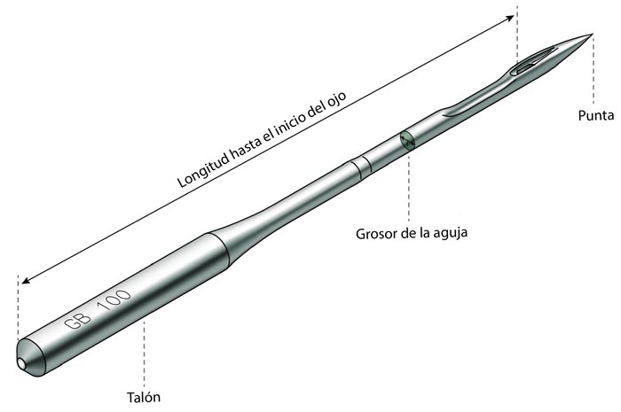 El talón hace referencia a la parte de la aguja que se introduce en el soporte de la máquina de coser. Es universal en cada sistema de agujas.